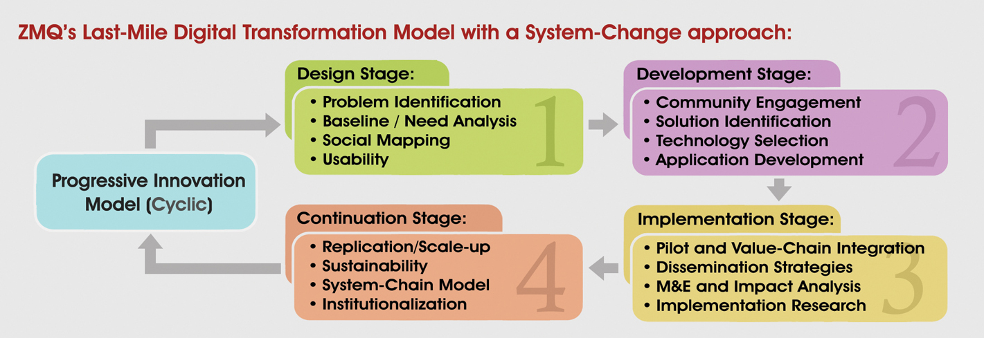 ZMQ has been a pioneer in T4D (Technology for Development) with over 25 years of experience of designing, developing, and implementing technology linked Development Models for underserved & unreached communities in low-resource settings of Asia and Africa. We have worked in the areas of health & nutrition, literacy & education, capacity building & livelihood, agriculture & food security, environment & biodiversity, climate change & its impact on health, conflicts & migration and other issues of sustainable development. Over the years ZMQ developed a Last-mile Digital Transformation Model with a System Change Approach (figure below). T4D model is based on a progressive innovation approach which fosters iterative improvements in its T4D solutions for accessibility, acceptability & adoption. Despite being designed for low-resource settings, the model is technology friendly and keeps pace with emerging technologies. ZMQ integrates AI4D outcomes in their T4D solutions. Once the AI4D models have achieved stability, ZMQ engages withe communities in building solutions based on predictive outcomes by integrating the models in their T4D solutions