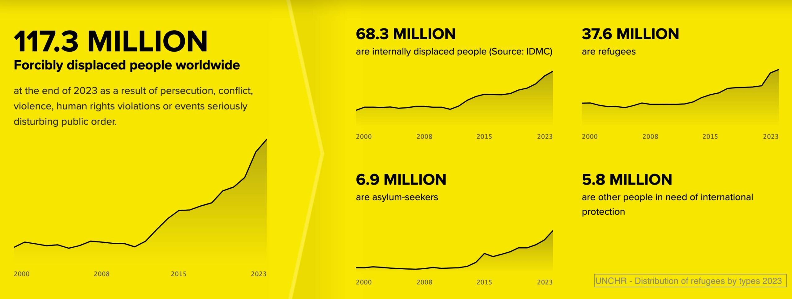 Global refugee problem refers to the large-scale displacement of people across the world due to a variety of crises. As of 2023, there are more than 117.3 million forcibly displaced people globally, the highest number in recorded history, driven by factors such as conflict, persecution, environmental disasters, and economic instability.